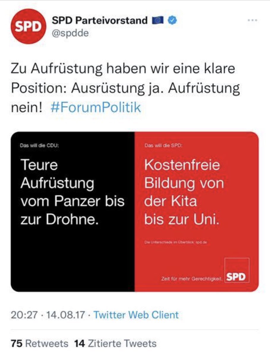 „Zu Aufrüstung haben wir eine klare Position: Ausrüstung ja. #Aufrüstung nein…Das will die CDU: Teure Aufrüstung vom#Panzer bis zur#Drohne“, twitterte@spdde. Soviel zum#SPD-#Spin „die@CDU ist am Zustand der#Bundeswehr schuld“#PutinsKriegpic.twitter.com/lYhK0bnPmd