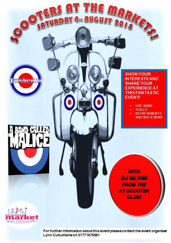 The Scooters at the Market event is coming to Rotherham Market on Saturday 4th August. Come along and see live music from A Band Called Malice plus there will be stalls, refreshments and more!