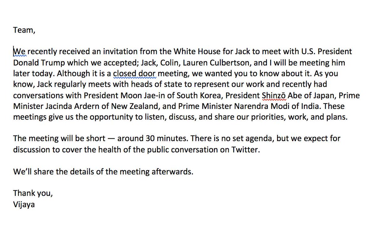 Here are the internal emails sent to Twitter employees. One is from Twitter policy and legal head Vijaya Gadde. The other is from CEO Jack Dorsey.pic.twitter.com/kwED7krPMN