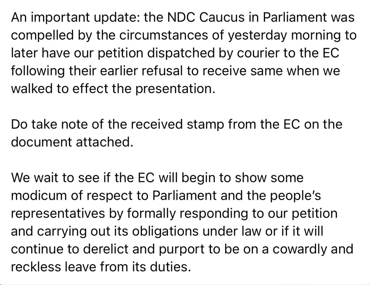 caucus under the distinguished leadership of Leader Haruna Iddrisu and Second Deputy Speaker Alban S.K. Bagbin presented evidence and the basis for the NDC’s rejection of the multiple results declared by the EC for the presidential contest and the dubious parliamentarypic.twitter.com/u8KIiyOy9P