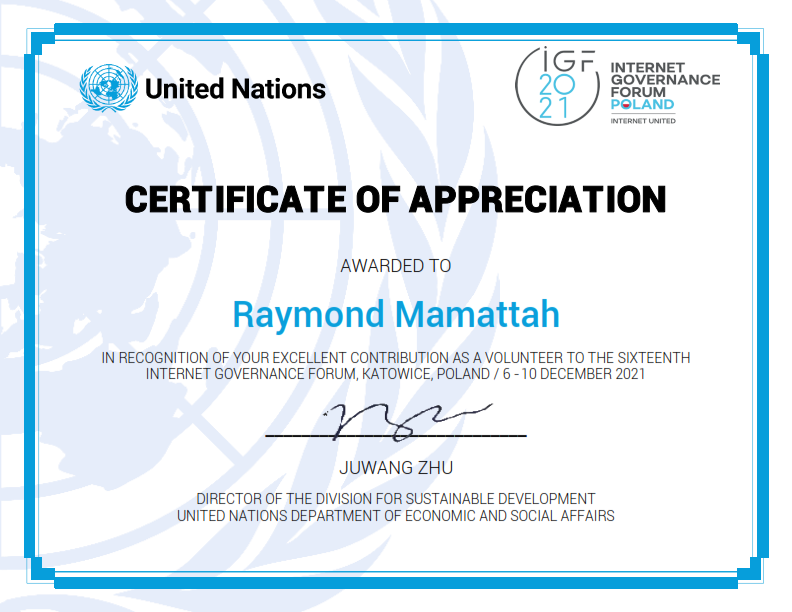 @intgovforum went well. I had the privilege to volunteer as co-host for some of the sessions. Thanks to the@UN for the opportunity to volunteer for the IGF once again.#EGIGFA#igf2021#IGF#UN#UNIGF#internetgovernance#Volunteeringpic.twitter.com/RhOrhzlfMC