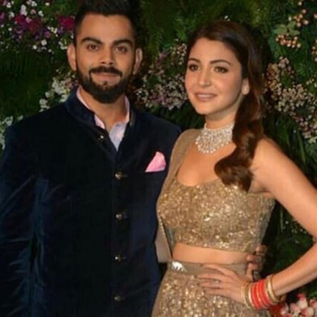 #CoupleGoals ! The Groom@imvkohli looks dapper in a classic#RaghavendraRathore#Bandhgala and#Breeches.at his wedding reception while the bride dazzles in#Sabyasachi .#Virushka#ViratKohli#AnushkaSharma#viratanushkapic.twitter.com/sZYixdeysA