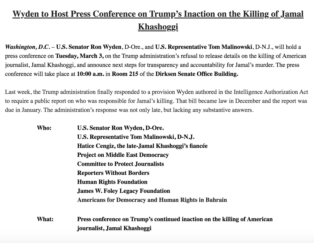 @RonWyden announces details of his press conference on Tuesday about next steps related to the DNI report on Jamal Khashoggi’s killing. He’ll be joined by Rep. Malinowski, Khashoggi’s fiancee, the Committee to Protect Journalists, Reporters Without Borders, and more:pic.twitter.com/GE063b8DFD