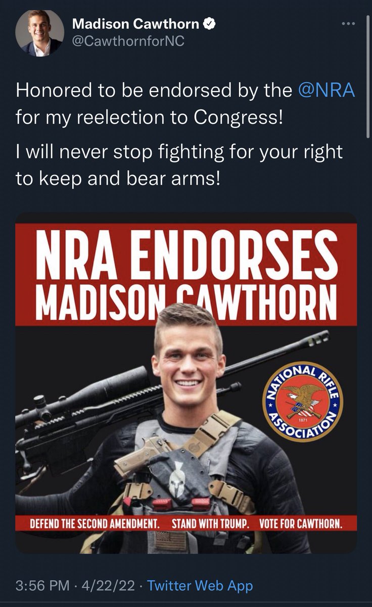 Madison Cawthorn posted this picture of himself holding a rifle with a scope and touting his NRA endorsement 9 minutes after DC police announced there was an active shooter situation with multiple victims.pic.twitter.com/s1cNomTora