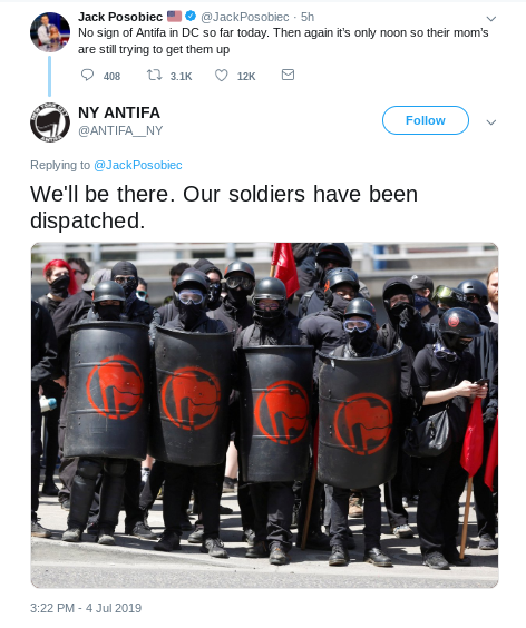 The fake antifa account ANTIFA_DC also engaged with Jack Posobiec, and vice versa. John Cardillo also jumped in on this one. 5/pic.twitter.com/VCQSqKsMbP