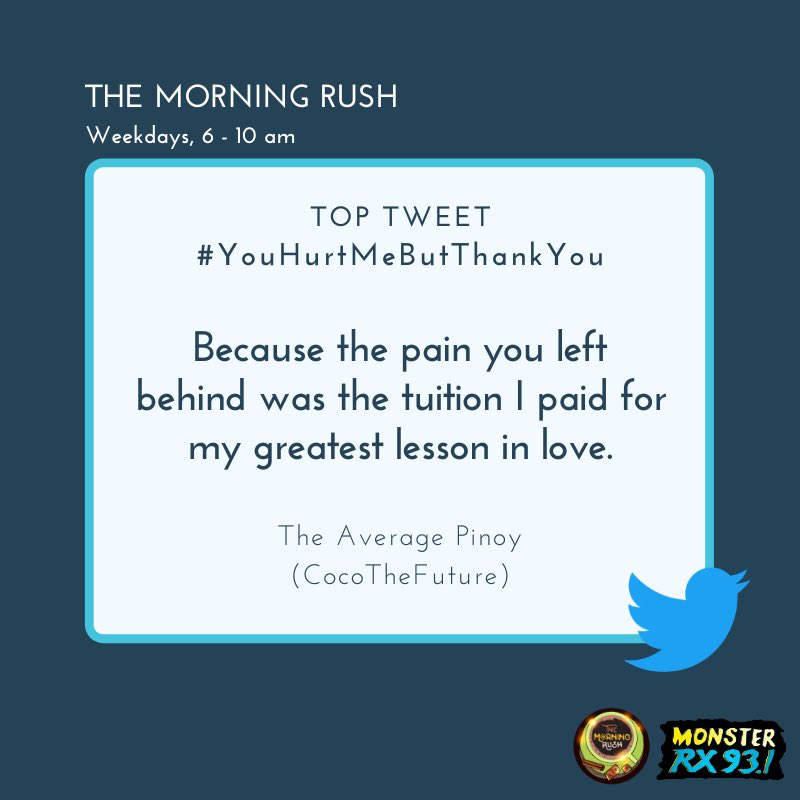 #YouHurtMeButThankYou Kasi pinatigas mo ko sa mga hamon ng buhay.#TheMorningRushHvala. Twitter će to iskoristiti za poboljšanje vaše vremenske crte. PoništiPoništi -