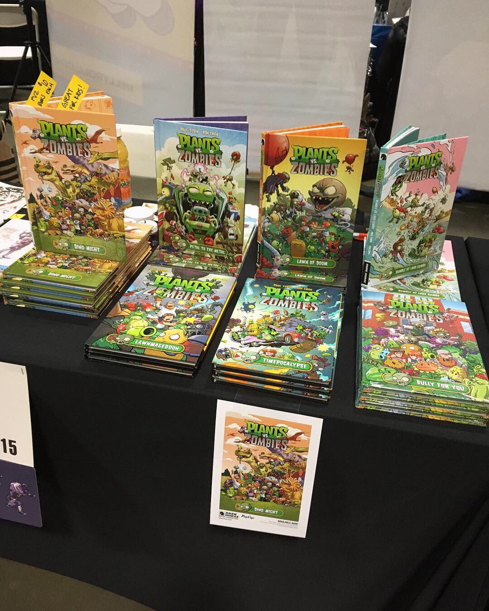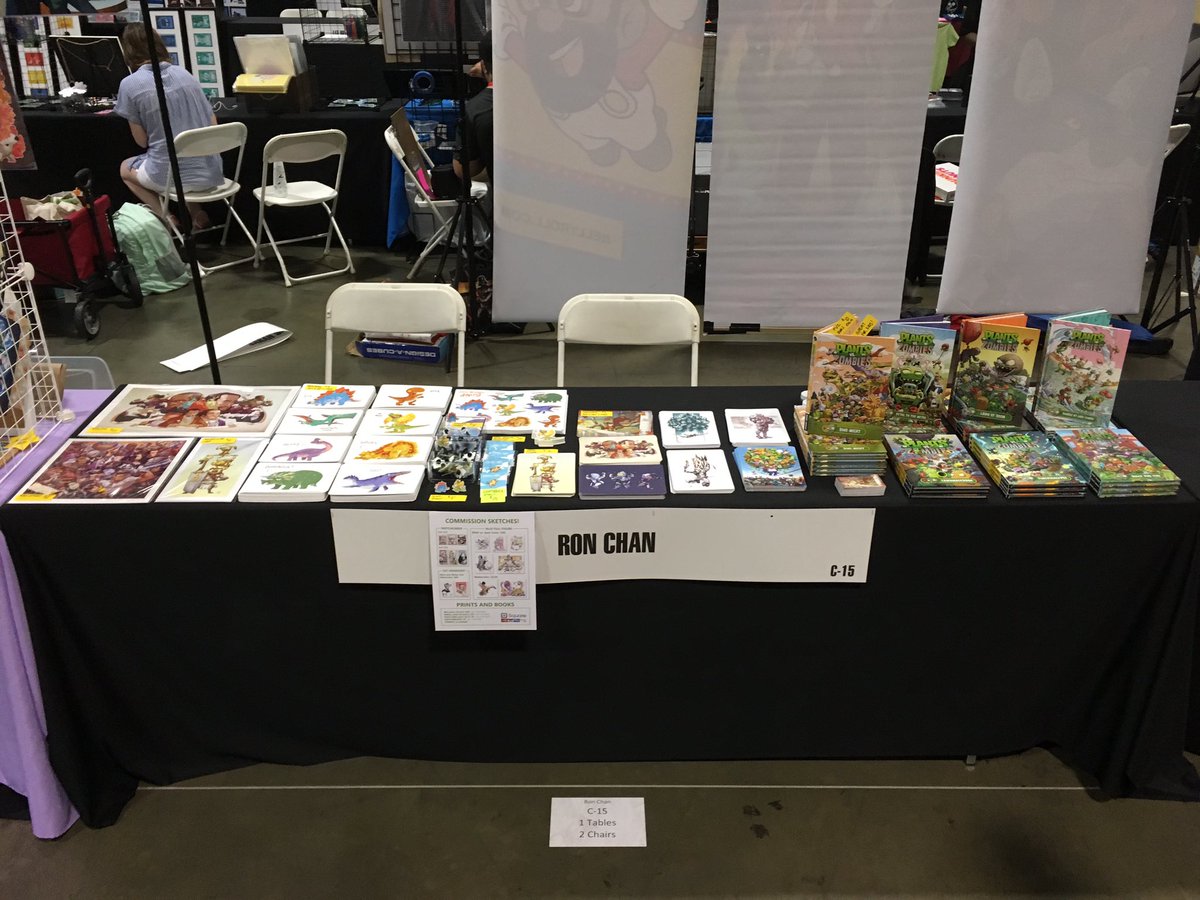 All ready for Awesome Con day two! Come by Artist Alley C-15 if you like: Plants vs Zombies books, cussing dinosaurs, Asian dudes in floral ties