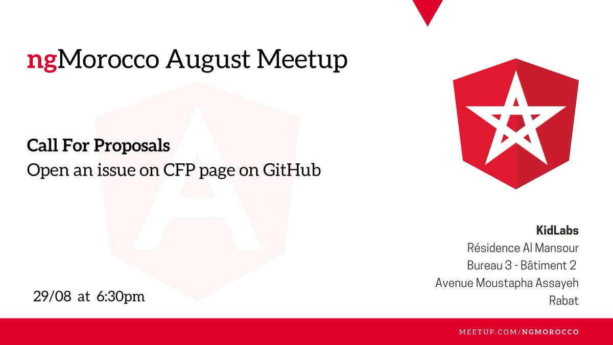 #Angular#Web#Node#javascript Book your place > http://tiny.cc/lwfdbz Talk proposals > https://github.com/ngMorocco/meetup-call-for-proposals/issues …pic.twitter.com/DDmY7YvYhP