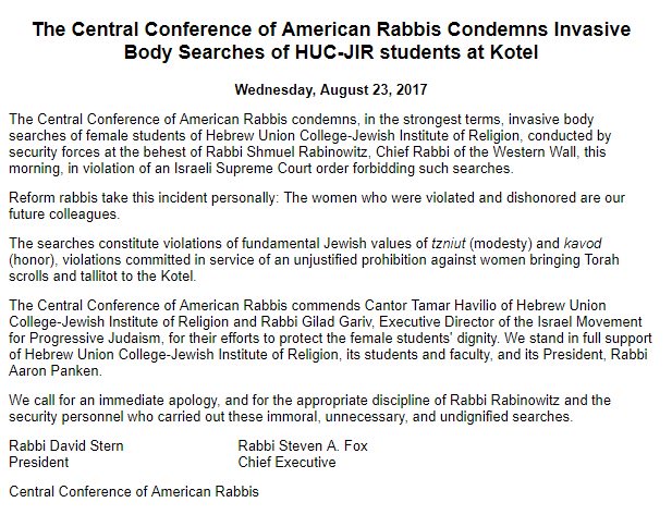 The Central Conference of American Rabbis Condemns Invasive Body Searches of HUC-JIR students at Kotel. http://ccarnet.org/about-us/news-and-events/ccar-condemns-invasive-body-searches-kotel/ …pic.twitter.com/PTfnCmkvTO