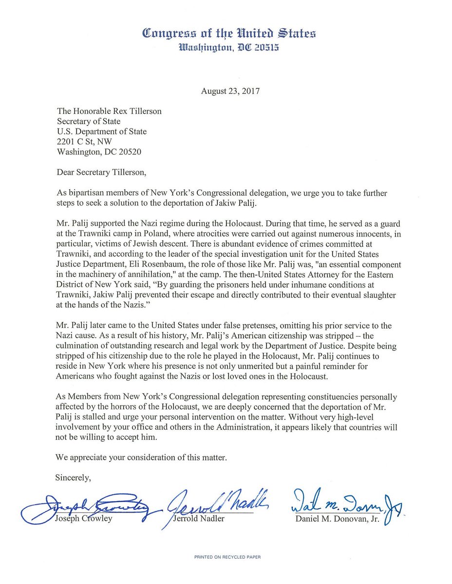 Bipartisan members of New York's Congressional delegation pen a letter asking Tillerson to deport a convicted Nazi guard living in Queens.pic.twitter.com/2XfTcMPDmO
