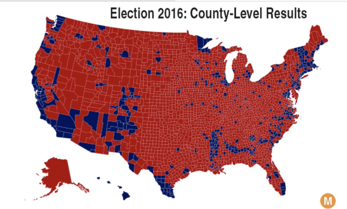 Think of the blue areas as the smarter, more cultured and compassionate people. Those red areas have people supporting Trump that lack in all three of those areas.