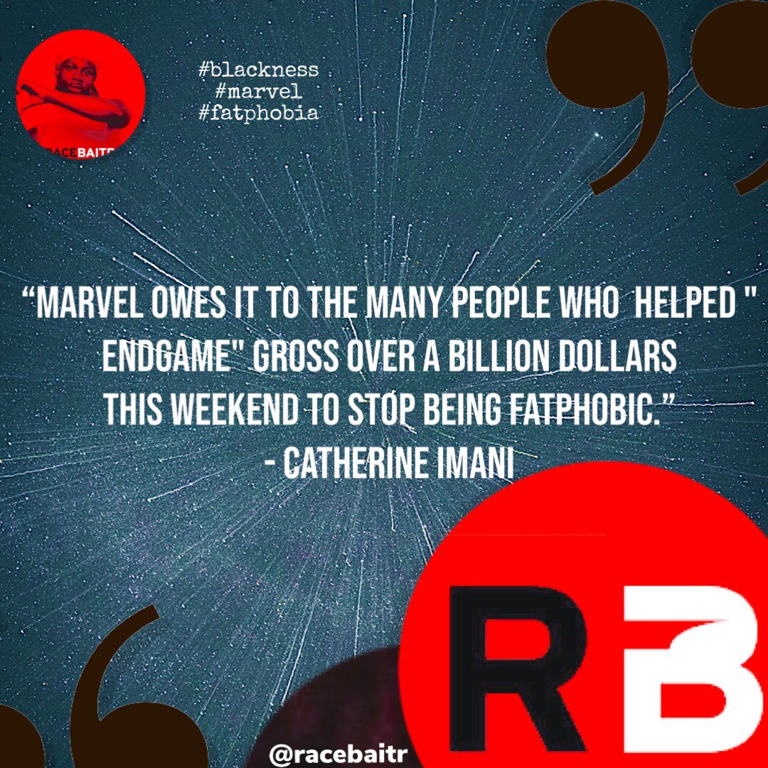 “Marvel owes it to the many people who helped "Endgame" gross over a billion dollars this weekend to stop being fatphobic.”-Catherine Imanihttps://racebaitr.com/2019/05/07/how-avengers-endgame-sabotaged-thors-character-development-for-a-movie-long-fat-joke/ …