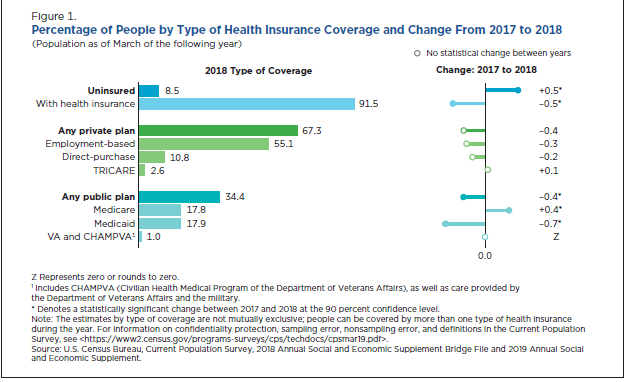 Census Bureau reports that uninsured rate rose significantly in 2018 (up to 8.5%); data also indicates substantial declines in Medicaid coverage and smaller drops in private coverage.pic.twitter.com/x6C6ttOvvP