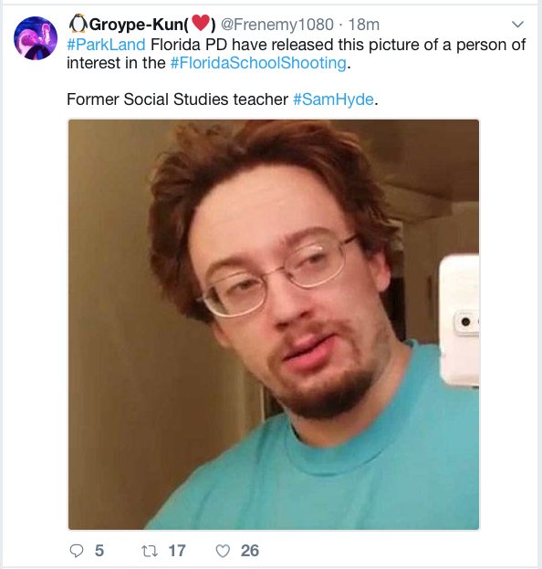 Welp. So much for being decent human beings today. /pol/ has arrived on scene and they're already spreading disinformation saying Sam Hyde is the suspect in #Parkland school shooting. Because /pol/ thinks school shootings are hilarious. /pol/ is filth. Don't be /pol/pic.twitter.com/aI6zwOYMmk