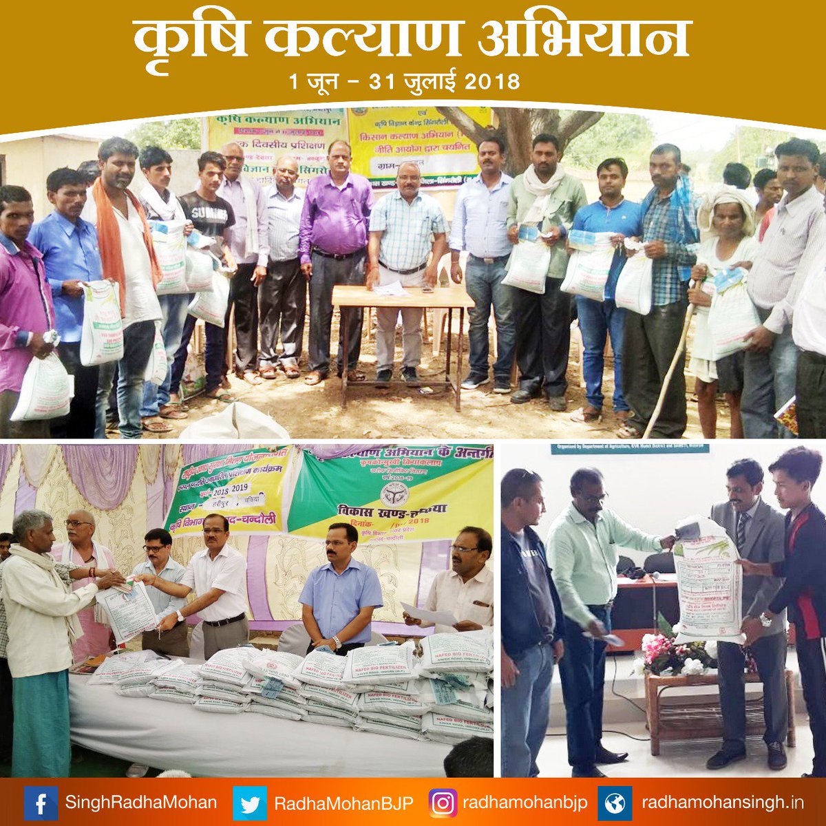 #KrishiKalyanAbhiyan : कृषि एवं किसान कल्याण मंत्रालय द्वारा 1 जून 2018 से 31 जुलाई 2018 तक देश के 112 आकांक्षी जिलों में "कृषि कल्याण अभियान" चलाया जा रहा है जिसके अंतर्गत किसानों को मिनी किट वितरित किये गये । #SaafNiyatSahiVikaspic.twitter.com/POyZI7uDWn