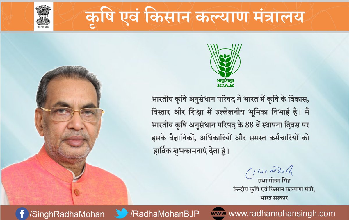 भा .कृ .अनु .परिषद के ८८ वें स्था. दिवस पर सभी देश के कृषि वैज्ञानिकों और कृषि उच्च शिक्षा से जुड़े लोगों को हार्दिक बधाई ।