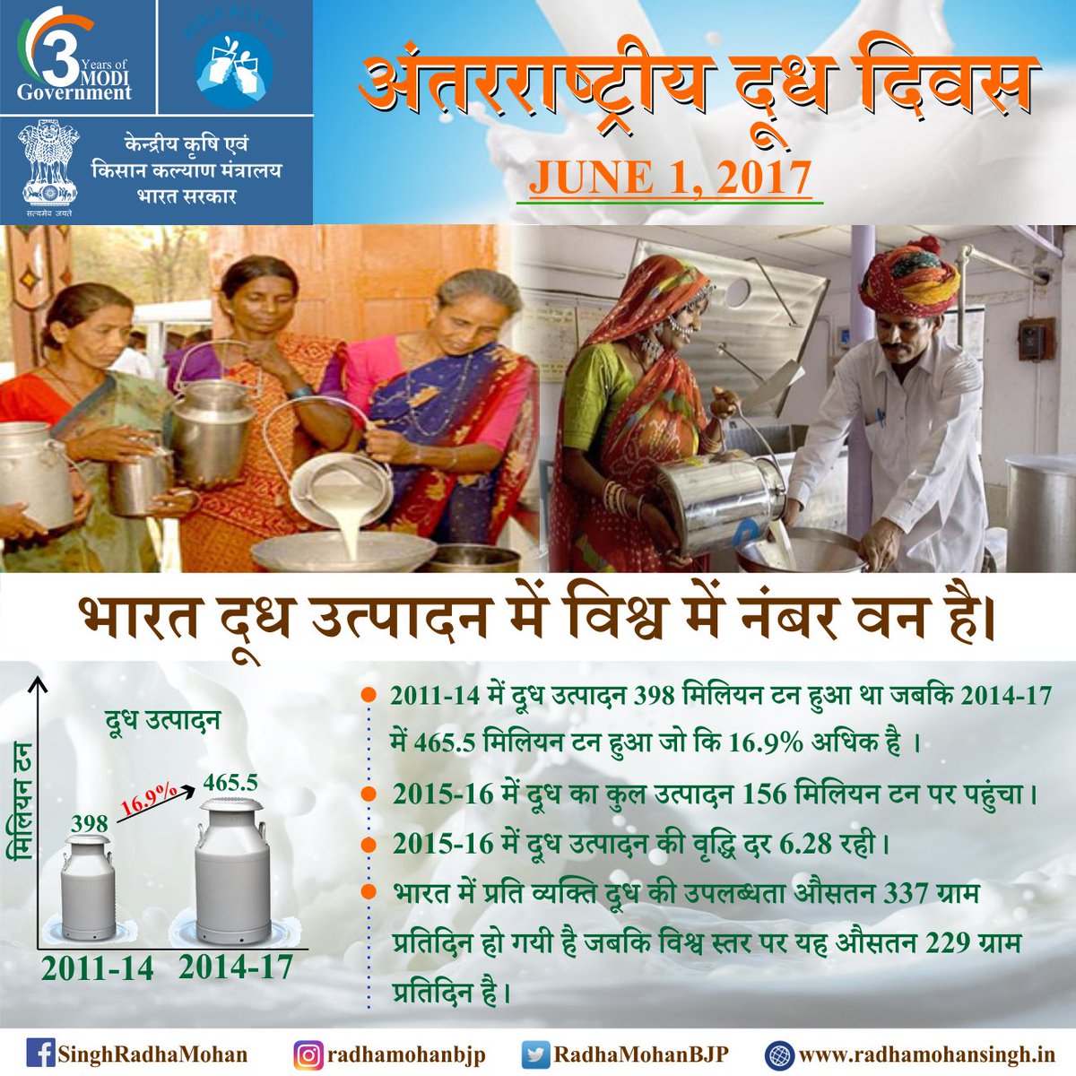 विश्व में दूध उत्पादन में भारत प्रथम रहा है। तीन वर्षों में दूध उत्पादन में 16.9% की वृद्धि आई है। #WorldMilkDay #worldmilkday2017pic.twitter.com/fjGJtrqq62
