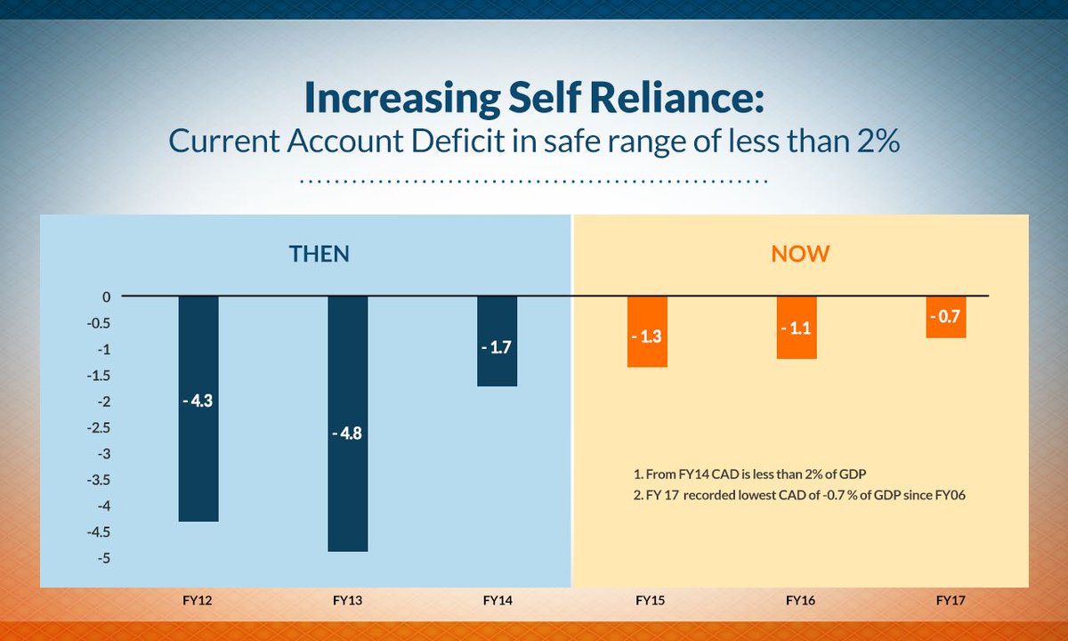 Increasing Self Reliance: Current Account Deficit in safe range of less than 2% #NewIndiaTakeOffpic.twitter.com/Yv55sAvLZv