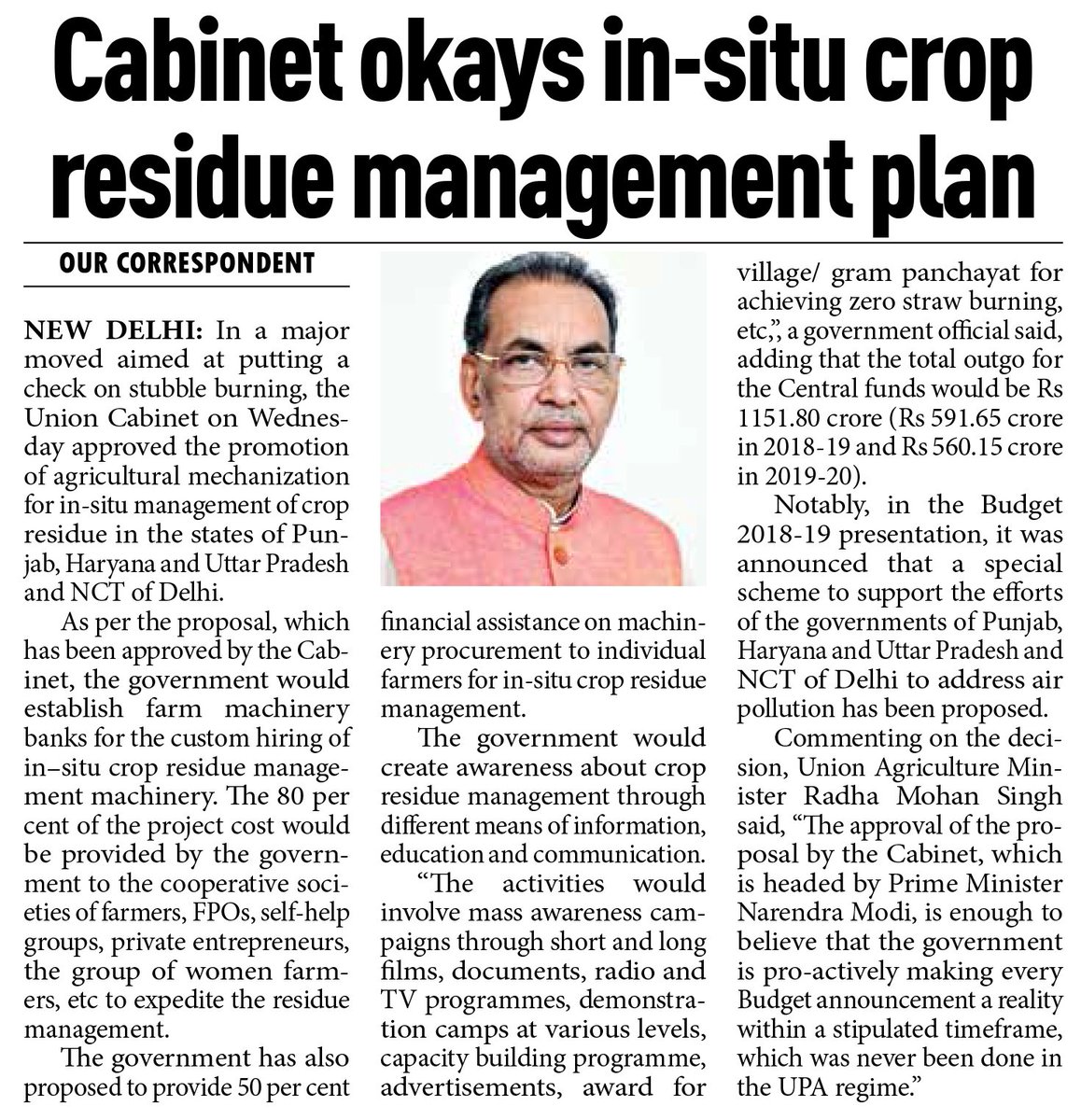 Well timed decision for #crop residue management . This will be a great compliance to the # NationalGreenTibunal order. Thank you for ur people friendly decision. @PMOIndia @drharshvardhan @dpradhanbjp