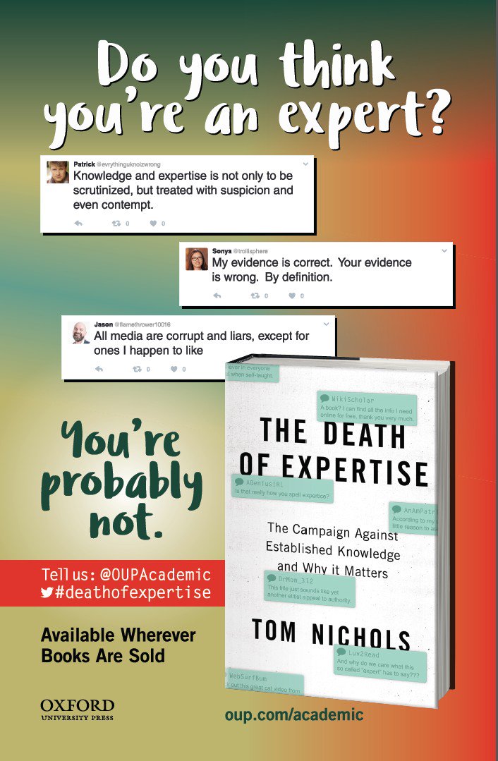 Think you're an expert? Maybe. Or maybe you're giving in to confirmation bias and wishful thinking. Find out here: https://www.amazon.com/Death-Expertise-Campaign-Established-Knowledge/dp/0190469412/ref=sr_1_1?ie=UTF8&qid=1446038305&sr=8-1&keywords=death+of+expertise …pic.twitter.com/xOPuyHbWBl