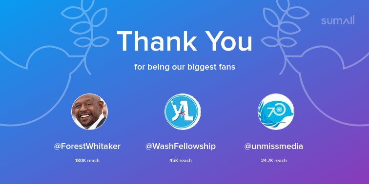 Our biggest fans this week: @ForestWhitaker, @WashFellowship, @unmissmedia. Thank you! via https://sumall.com/thankyou?utm_source=twitter&utm_medium=publishing&utm_campaign=thank_you_tweet&utm_content=text_and_media&utm_term=fd711726bb0e02f2dd03cd8b …pic.twitter.com/6WLneOG3xF