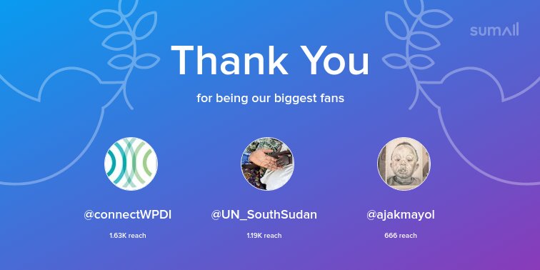 Our biggest fans this week: @connectWPDI, @UN_SouthSudan, @ajakmayol. Thank you! via https://sumall.com/thankyou?utm_source=twitter&utm_medium=publishing&utm_campaign=thank_you_tweet&utm_content=text_and_media&utm_term=fd711726bb0e02f2dd03cd8b …pic.twitter.com/qtKKQRWkHL