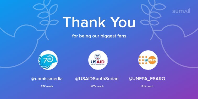 Our biggest fans this week: @unmissmedia, @USAIDSouthSudan, @UNFPA_ESARO. Thank you! via https://sumall.com/thankyou?utm_source=twitter&utm_medium=publishing&utm_campaign=thank_you_tweet&utm_content=text_and_media&utm_term=fd711726bb0e02f2dd03cd8b …pic.twitter.com/FzzFSLgg82