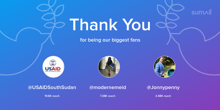 Our biggest fans this week: @USAIDSouthSudan, @modernemeid, @Jonnypenny. Thank you! via https://sumall.com/thankyou?utm_source=twitter&utm_medium=publishing&utm_campaign=thank_you_tweet&utm_content=text_and_media&utm_term=fd711726bb0e02f2dd03cd8b …pic.twitter.com/JS2wsFOBjp