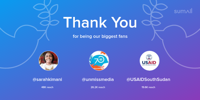 Our biggest fans this week: @sarahkimani, @unmissmedia, @USAIDSouthSudan. Thank you! via https://sumall.com/thankyou?utm_source=twitter&utm_medium=publishing&utm_campaign=thank_you_tweet&utm_content=text_and_media&utm_term=fd711726bb0e02f2dd03cd8b …pic.twitter.com/J5tBS5Ajrj