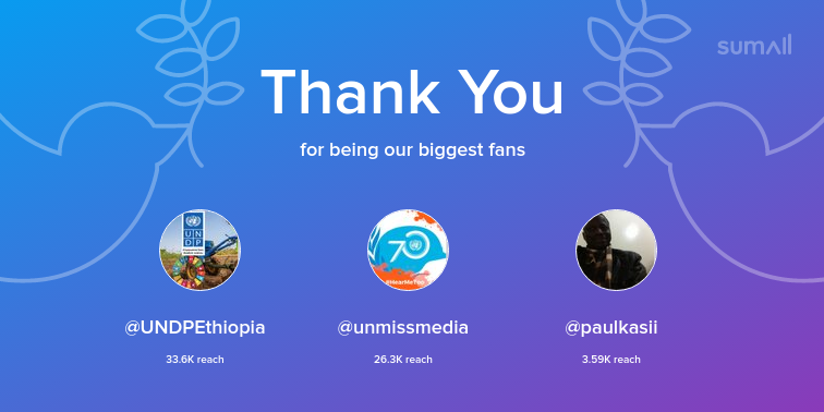 Our biggest fans this week: @UNDPEthiopia, @unmissmedia, @paulkasii. Thank you! via https://sumall.com/thankyou?utm_source=twitter&utm_medium=publishing&utm_campaign=thank_you_tweet&utm_content=text_and_media&utm_term=fd711726bb0e02f2dd03cd8b …pic.twitter.com/TXPY7AU7sZ
