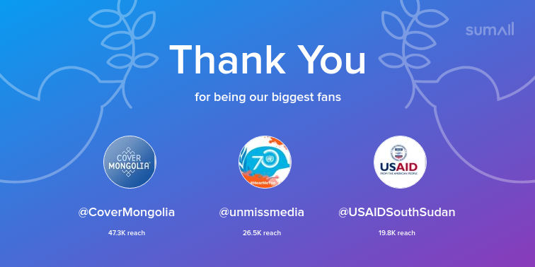Our biggest fans this week: @CoverMongolia, @unmissmedia, @USAIDSouthSudan. Thank you! via https://sumall.com/thankyou?utm_source=twitter&utm_medium=publishing&utm_campaign=thank_you_tweet&utm_content=text_and_media&utm_term=fd711726bb0e02f2dd03cd8b …pic.twitter.com/ExcnC1IZLp
