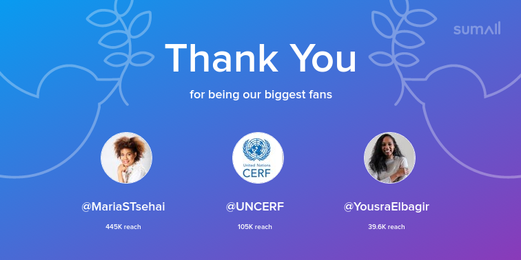 Our biggest fans this week: @MariaSTsehai, @UNCERF, @YousraElbagir. Thank you! via https://sumall.com/thankyou?utm_source=twitter&utm_medium=publishing&utm_campaign=thank_you_tweet&utm_content=text_and_media&utm_term=fd711726bb0e02f2dd03cd8b …pic.twitter.com/fZzpuvEiM0