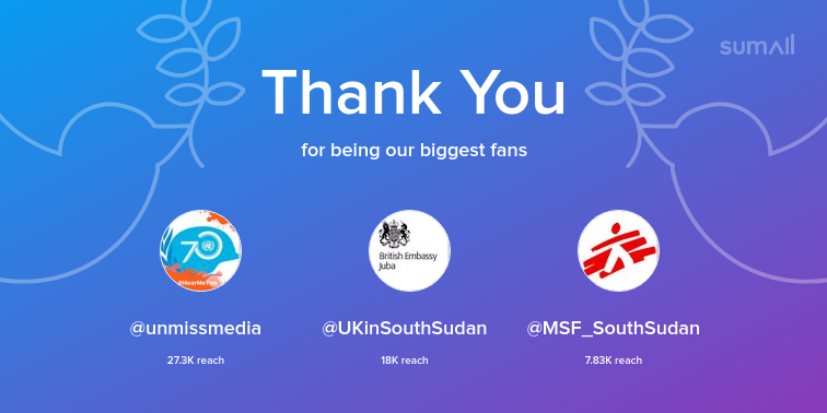 Our biggest fans this week: unmissmedia, UKinSouthSudan, MSF_SouthSudan. Thank you! via https://sumall.com/thankyou?utm_source=twitter&utm_medium=publishing&utm_campaign=thank_you_tweet&utm_content=text_and_media&utm_term=fd711726bb0e02f2dd03cd8b …pic.twitter.com/Vmo6Z3oXed