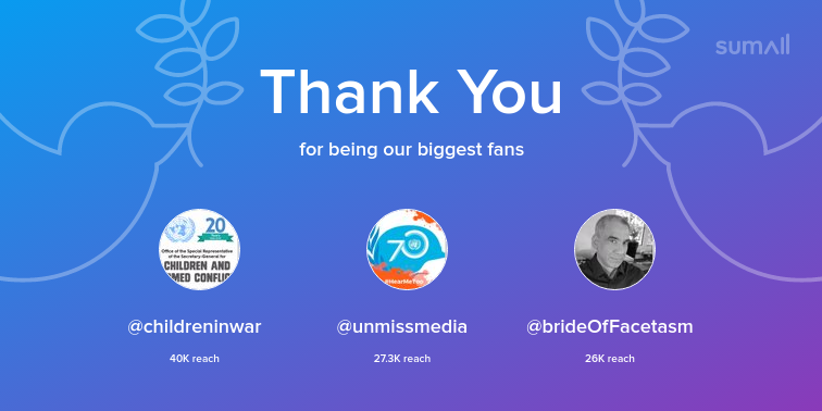 Our biggest fans this week: childreninwar, unmissmedia, brideOfFacetasm. Thank you! via https://sumall.com/thankyou?utm_source=twitter&utm_medium=publishing&utm_campaign=thank_you_tweet&utm_content=text_and_media&utm_term=fd711726bb0e02f2dd03cd8b …pic.twitter.com/nRyXafODPE