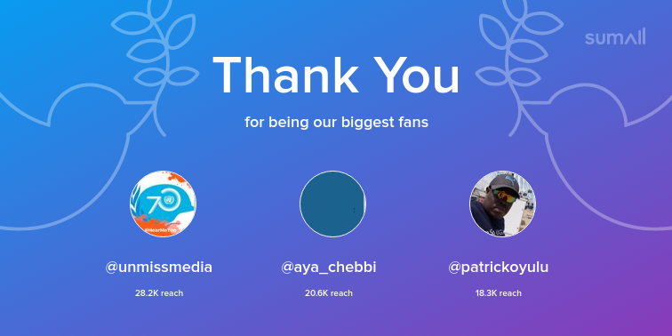 Our biggest fans this week: unmissmedia, aya_chebbi, patrickoyulu. Thank you! via https://sumall.com/thankyou?utm_source=twitter&utm_medium=publishing&utm_campaign=thank_you_tweet&utm_content=text_and_media&utm_term=fd711726bb0e02f2dd03cd8b …pic.twitter.com/TaZ0IBohK5