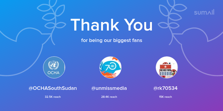 Our biggest fans this week: OCHASouthSudan, unmissmedia, rk70534. Thank you! via https://sumall.com/thankyou?utm_source=twitter&utm_medium=publishing&utm_campaign=thank_you_tweet&utm_content=text_and_media&utm_term=fd711726bb0e02f2dd03cd8b …pic.twitter.com/lFR66UffK5