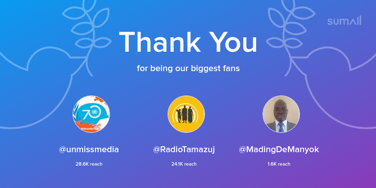 Our biggest fans this week: unmissmedia, RadioTamazuj, MadingDeManyok. Thank you! via https://sumall.com/thankyou?utm_source=twitter&utm_medium=publishing&utm_campaign=thank_you_tweet&utm_content=text_and_media&utm_term=fd711726bb0e02f2dd03cd8b …pic.twitter.com/61PwwZP58d