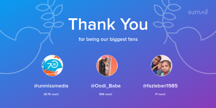 Our biggest fans this week: unmissmedia, Oodi_Baba, fazlebari1985. Thank you! via https://sumall.com/thankyou?utm_source=twitter&utm_medium=publishing&utm_campaign=thank_you_tweet&utm_content=text_and_media&utm_term=fd711726bb0e02f2dd03cd8b …pic.twitter.com/gsq9cMa8Ja