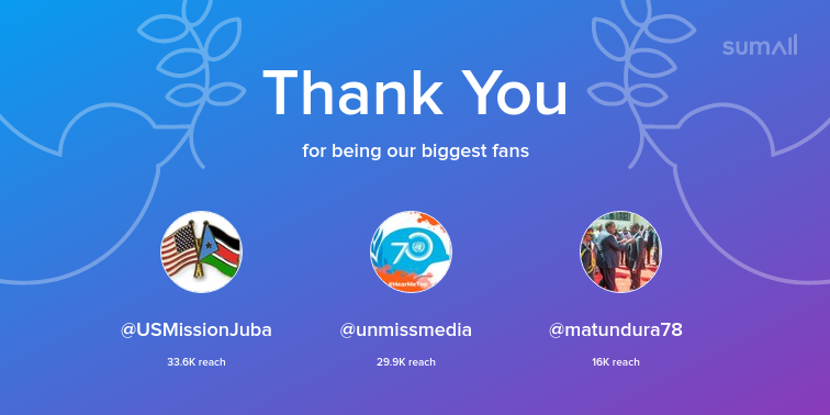 Our biggest fans this week: USMissionJuba, unmissmedia, matundura78. Thank you! via https://sumall.com/thankyou?utm_source=twitter&utm_medium=publishing&utm_campaign=thank_you_tweet&utm_content=text_and_media&utm_term=fd711726bb0e02f2dd03cd8b …pic.twitter.com/v2f8UCdztz