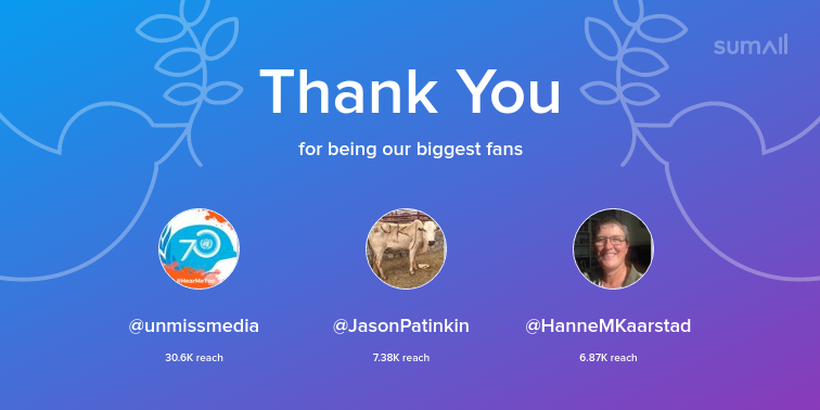 Our biggest fans this week: unmissmedia, JasonPatinkin, HanneMKaarstad. Thank you! via https://sumall.com/thankyou?utm_source=twitter&utm_medium=publishing&utm_campaign=thank_you_tweet&utm_content=text_and_media&utm_term=fd711726bb0e02f2dd03cd8b …pic.twitter.com/onhFBDJxsx