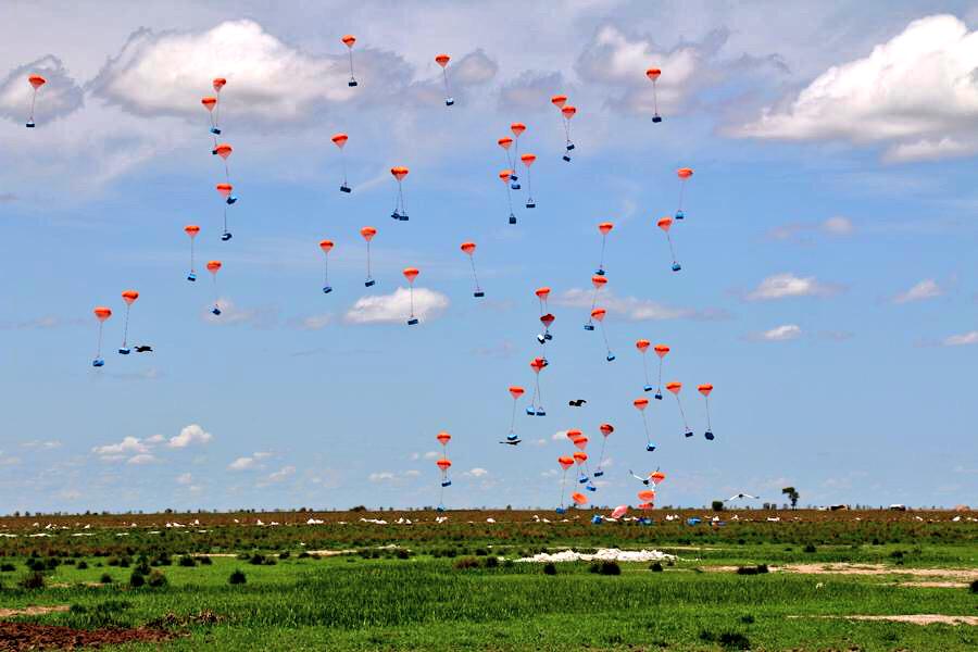 Success! First @WFP airdrop of vegetable oil completed in #SouthSudan. Btw: those are little orange parachutes pic.twitter.com/fXKKydPNSi
