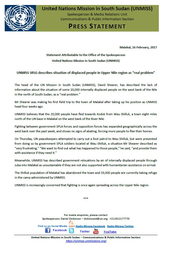 UNMISS SRSG describes situation of displaced people in Upper Nile region of #SouthSudan as “real problem”pic.twitter.com/P1NLDjuKhL