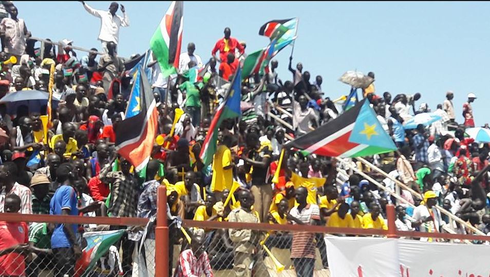 #SouthSudan Minister of Sports Nadia Arop takes to the football pitch at Juba stadium greeting the Ugandan team ahead of the match. Anthempic.twitter.com/hn7PMooB2y