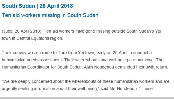 10 aid workers have gone missing outside Yei town - #UNOCHA #SouthSudan pic.twitter.com/hcXyC1Idph