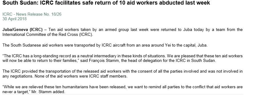 Just in: Ten aid workers who were detained while on an assessment mission near Yei, Central Equatoria, have been freed. The local aid workers were returned to Juba by a team from the International Committee of the Red Cross - the ICRC,http://ow.ly/ozcc30jKBuf  @ICRC @unmissmediapic.twitter.com/lQP6xQTG3A