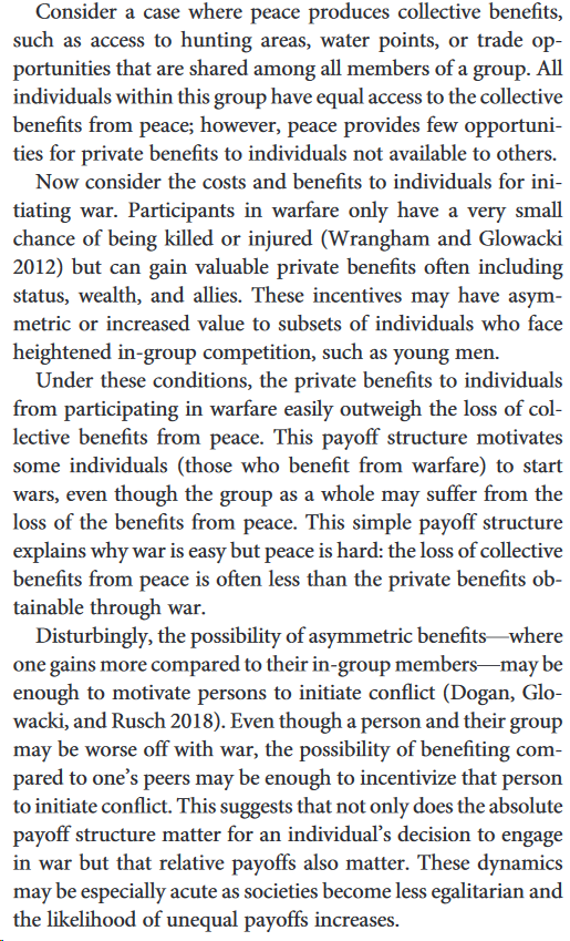 "Even though a person and their group may be worse off with war, the possibility of benefiting compared to one’s peers may be enough to incentivize that person to initiate conflict." https://docs.wixstatic.com/ugd/9a6397_58df37d6e6de4e6fb49614f230959f0e.pdf …