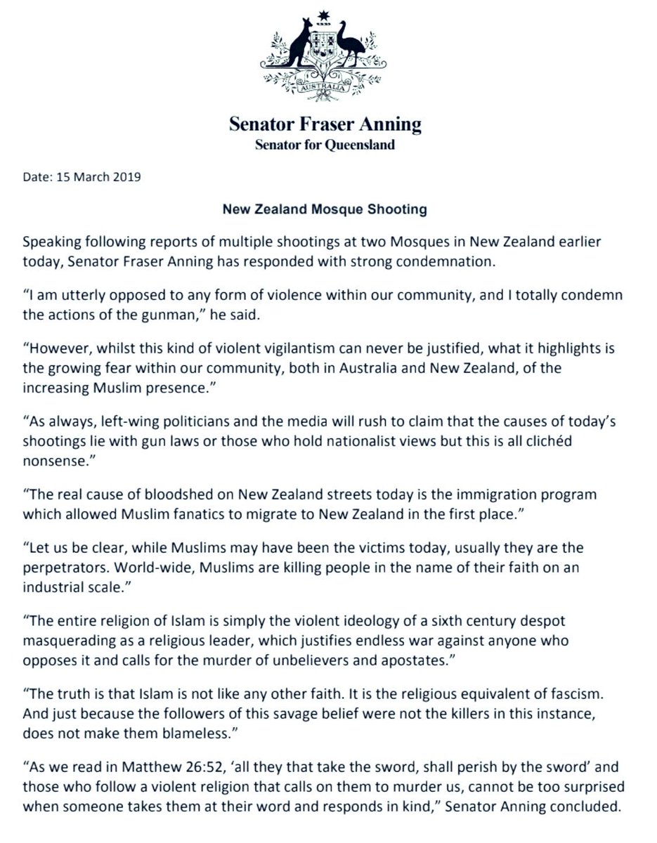 Sickening statement from Queensland Senator Anning on the heartbreaking events in Christchurch. https://www.google.ie/amp/s/www.rte.ie/amp/1036591/ …pic.twitter.com/7ls6RKoNMS