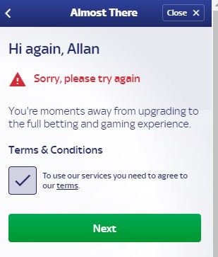 @skybet why am i allowed to deposit funds onto an account before I upgrade it? and why when i try to upgrade do i get this?pic.twitter.com/0YRjSK5ydi