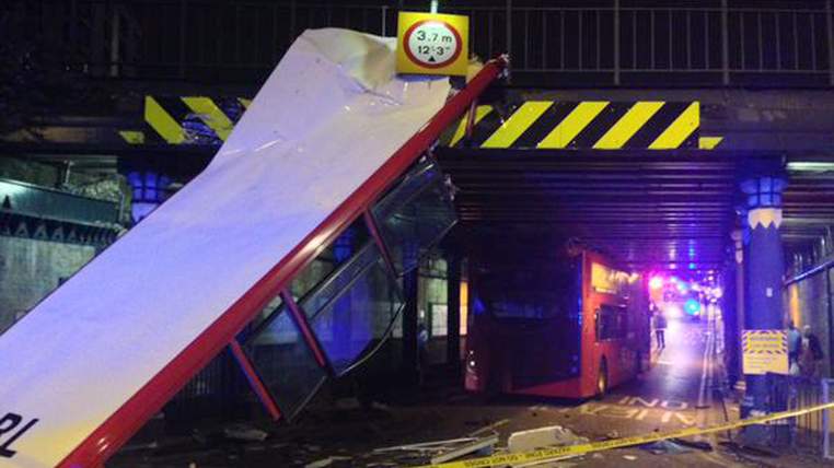Seven people injured as bus roof ripped off after it hits bridge in south London http://l-bc.co/jLYkCv pic.twitter.com/KFDoJ1Aea1
