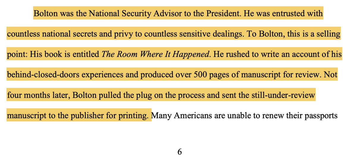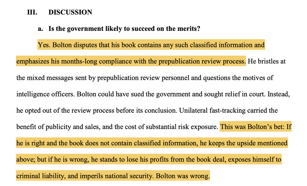 THREAD: 1. INCREDIBLE ruling by Judge Lamberth on the #BookDealBolton saga today. He basically concludes John Bolton is a traitor to his country. He says his rush to publish the book outside of reasonable review by intel officials means it's too late to stop it.pic.twitter.com/d4JgeHuiQw